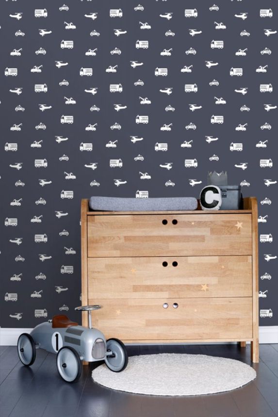 Blau-weiße Vliestapete für Jungen Autos, Hubschrauber 138916, Little Bandits, Esta Blau-weiße Vliestapete für Jungen Autos, Hubschrauber 138916, Little Bandits, Esta