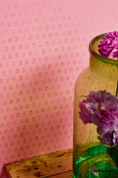 Regelmäßiges Muster mit goldenen Käfern auf einer cremeweißen Vliestapete.
