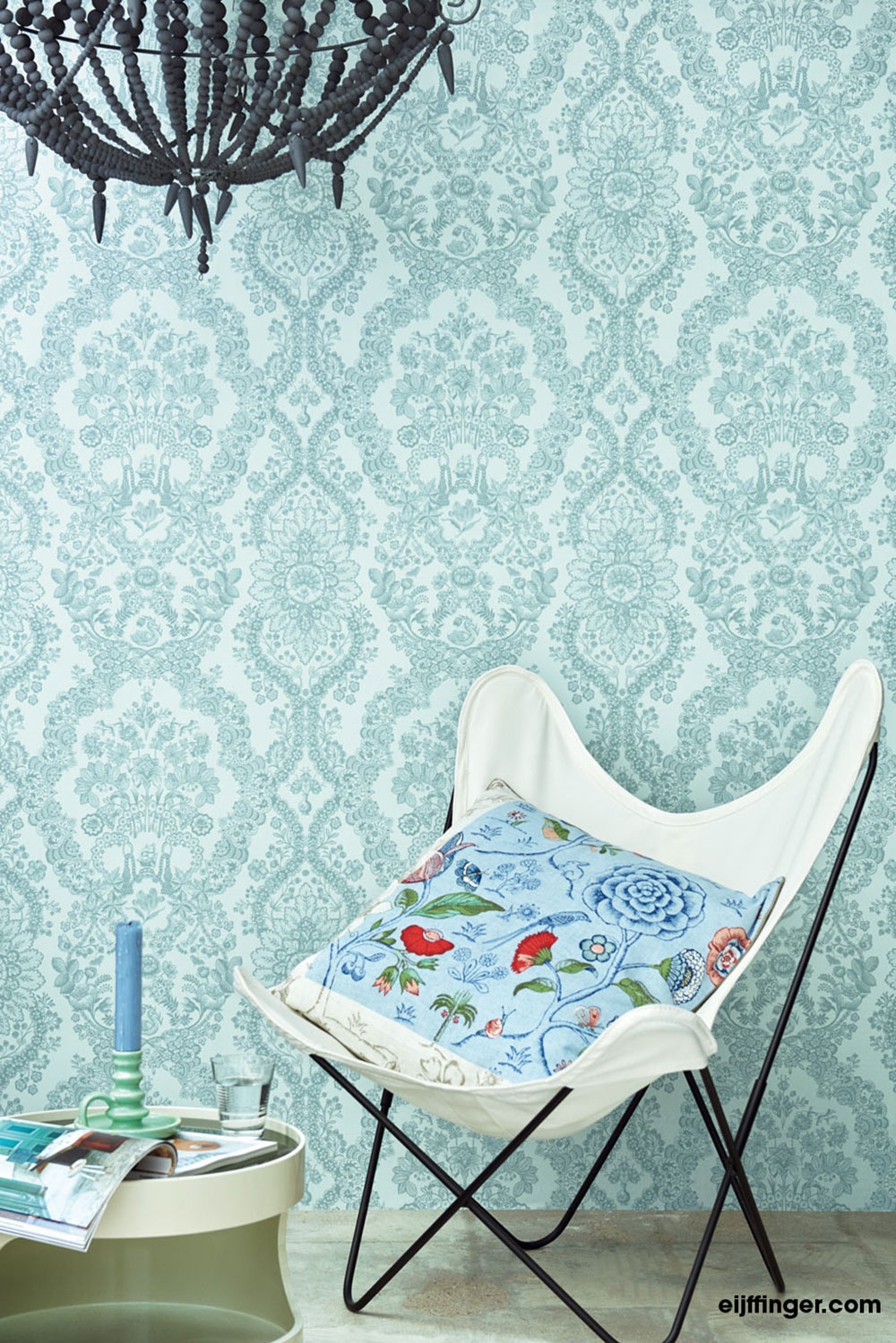 Barockes Muster mit Pflanzen- und Tiermotiven auf türkisfarbener Vliestapete.