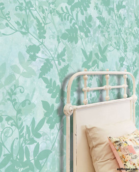 Türkis-blau-weiße Tapete Wandbilder mit Naturmotiven - Ton-in-Ton Zweige und Blätter.
