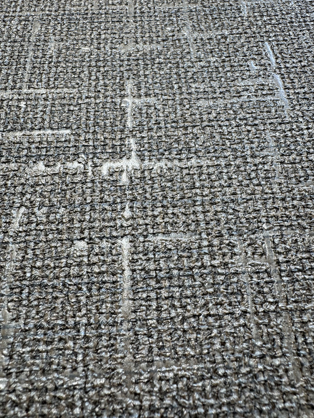 Luxuriöse Vliestapete mit Vinyloberfläche - graue / grau-beige grobe Gewebestruktur mit transluzentem silbernem Hintergrund. Die Farben und Highlights auf der Tapete verändern sich je nach Lichteinfall.