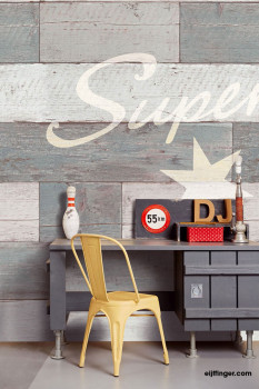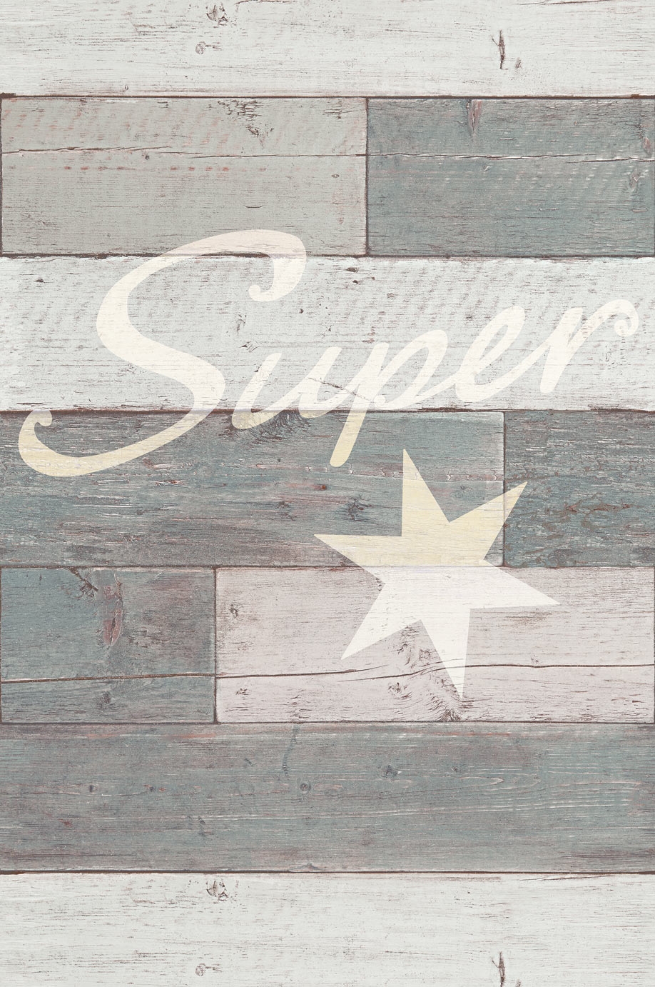 Vliestapete mit Holzoptik und Schriftzug – ideal für das Jugendzimmer.