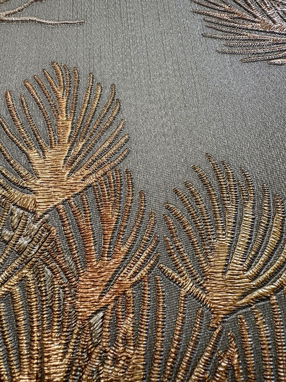 Luxuriöse graugrüne Vliestapete mit Vinyloberfläche, halbglänzendem Kupfer und grauen Baumzweigen.