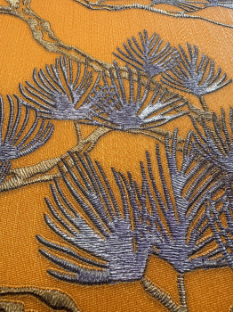 Luxuriöse orangefarbene Vliestapete mit Vinyloberfläche, halbglänzende blaue Baumzweige.