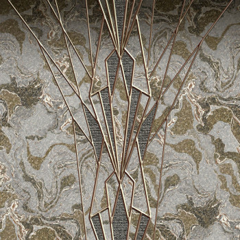 Luxuriöse Fototapete mit Marmormotiv und geometrischem Muster auf grau strukturiertem Hintergrund.