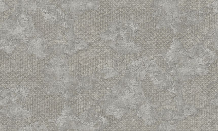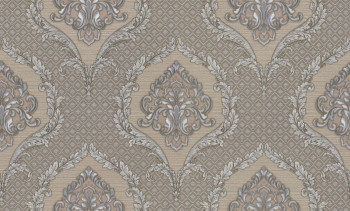 Luxuriöse metallische braun-silberne Barocktapete mit Ornamenten auf geometrischem Hintergrund.