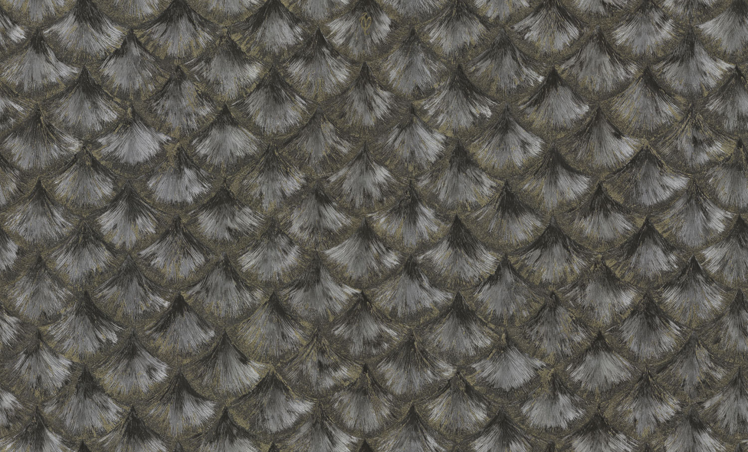 Silber-schwarze Luxustapete mit einem geometrischen Muster in Form von Fischschuppen mit goldenen Reflexen. Das Foto des Innenraums dient nur der Veranschaulichung – verschiedene Farben.