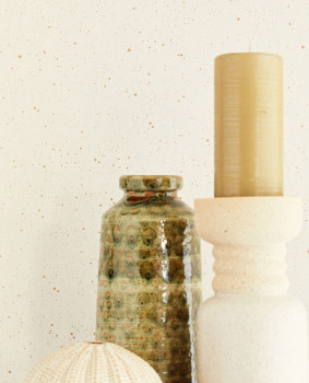 Zart geprägte cremefarbene Vliestapete, Putzstruktur, kleine gold-beigefarbene Metallic-Punkte.