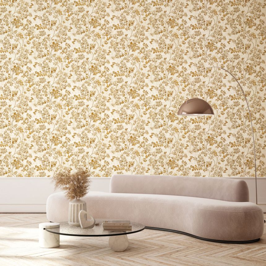 Luxuriöse Vliestapete mit Vinyloberfläche - geprägtes, halbglänzendes, goldbraunes Muster aus Zweigen mit Blättern auf goldbraun-beigem marmoriertem Hintergrund.