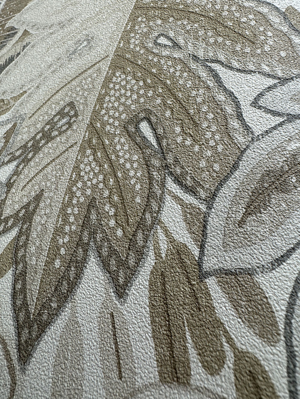 Beige Vliestapete, Blätter, feine Textur.