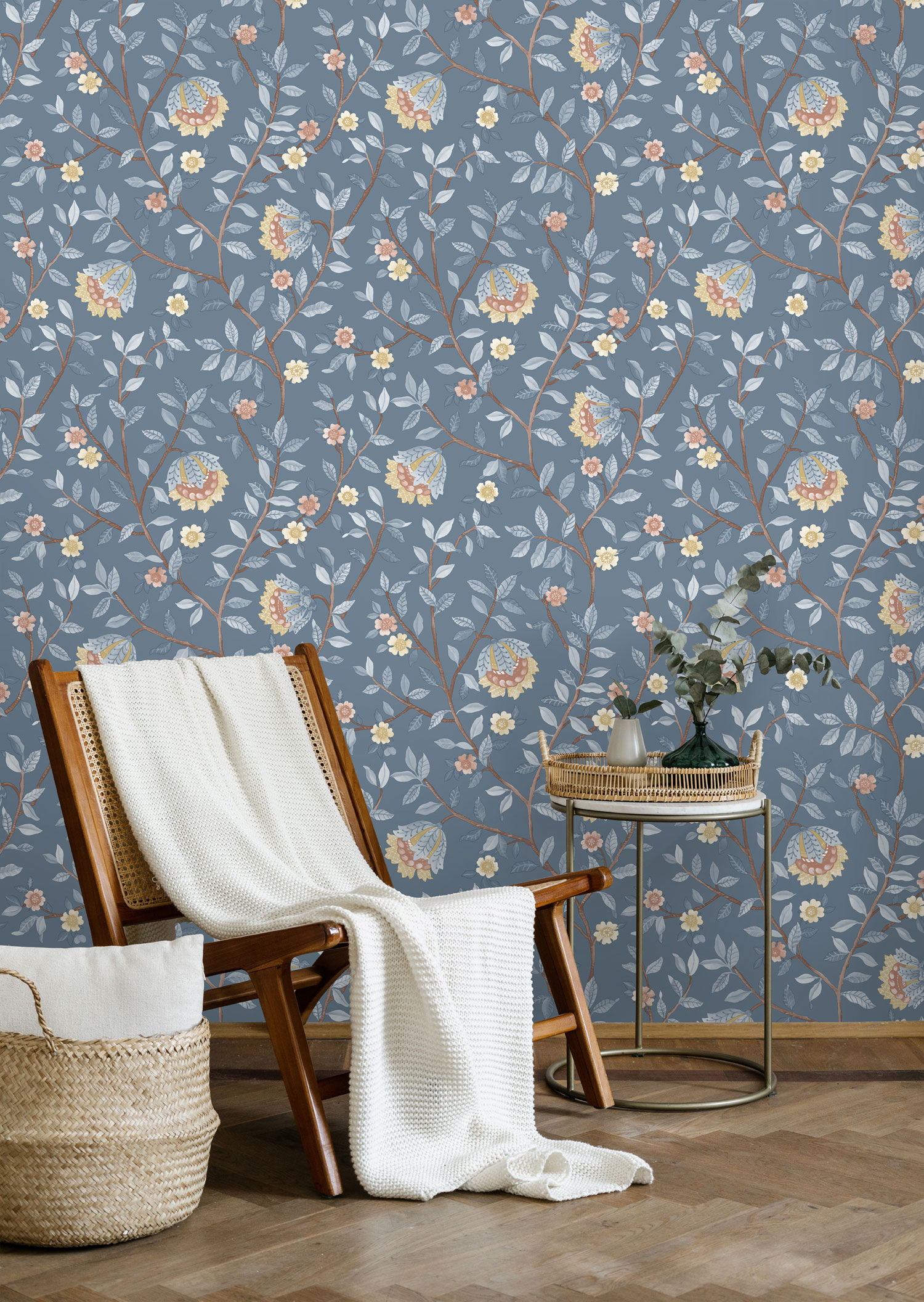 Blaue Vliestapete, Blumenmotive in Blau-, Braun- und Ockertönen.