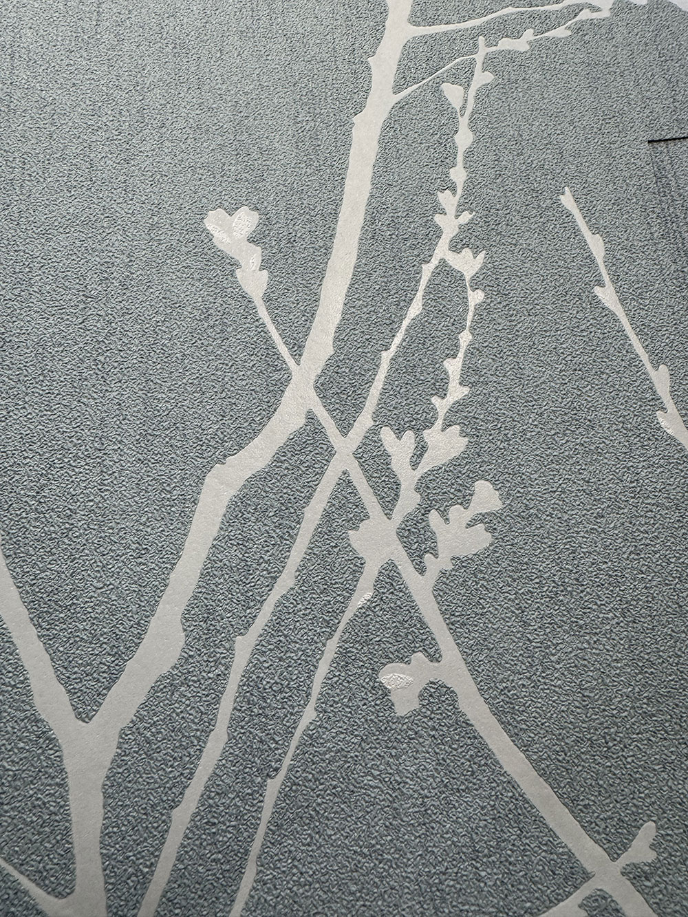 Blaue Vliestapete, Stoffimitat, glatte weiße Zweige.
