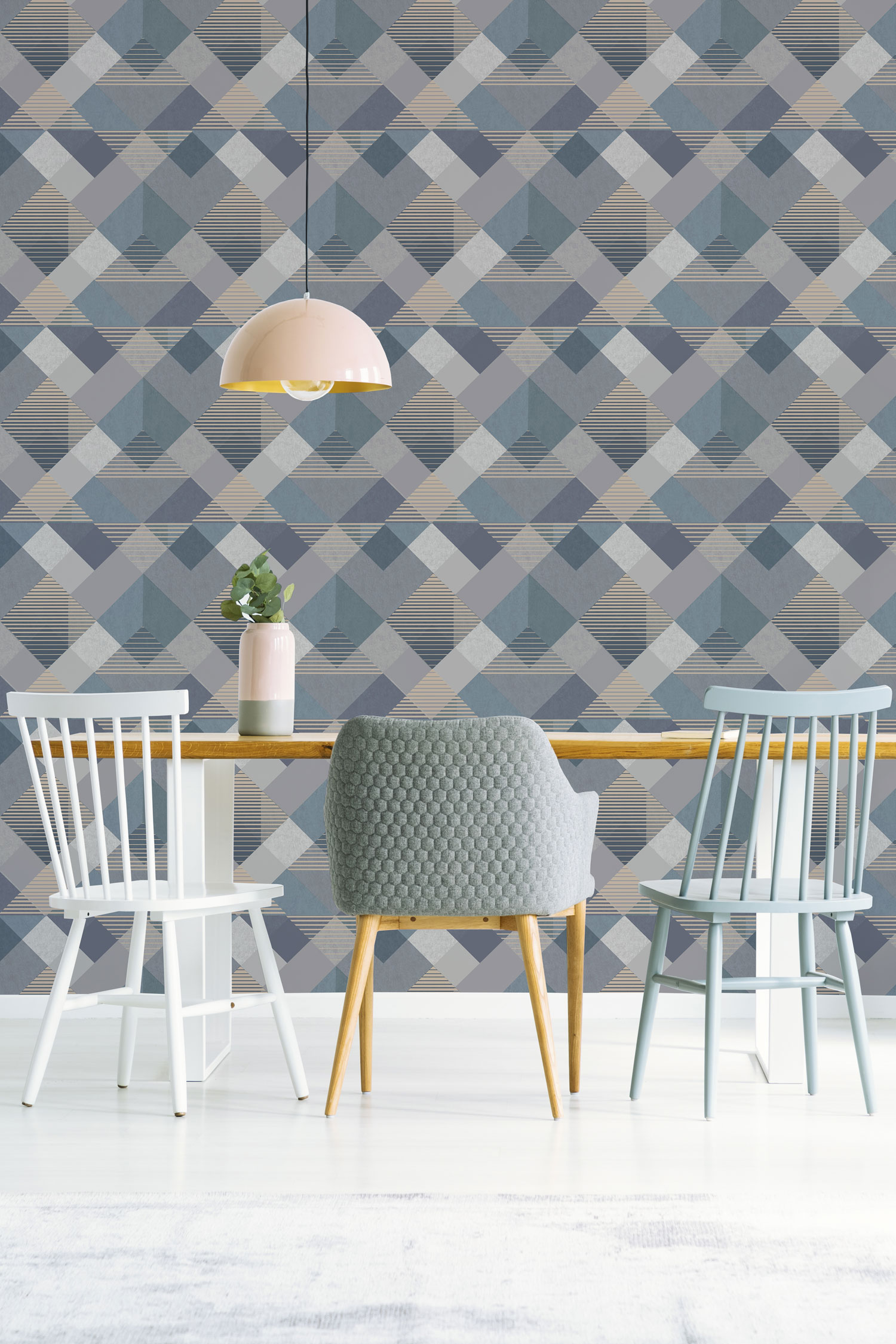 Vliestapete, geometrisches Muster in Blau- und Grautönen, Linien in hellgoldener Farbe.