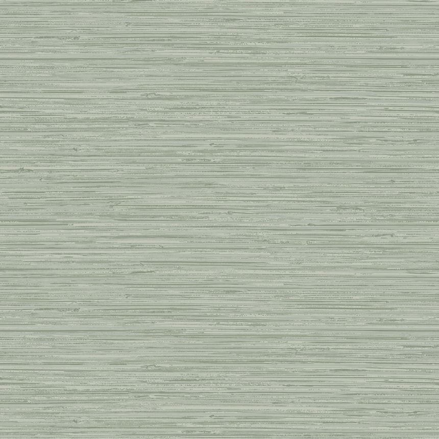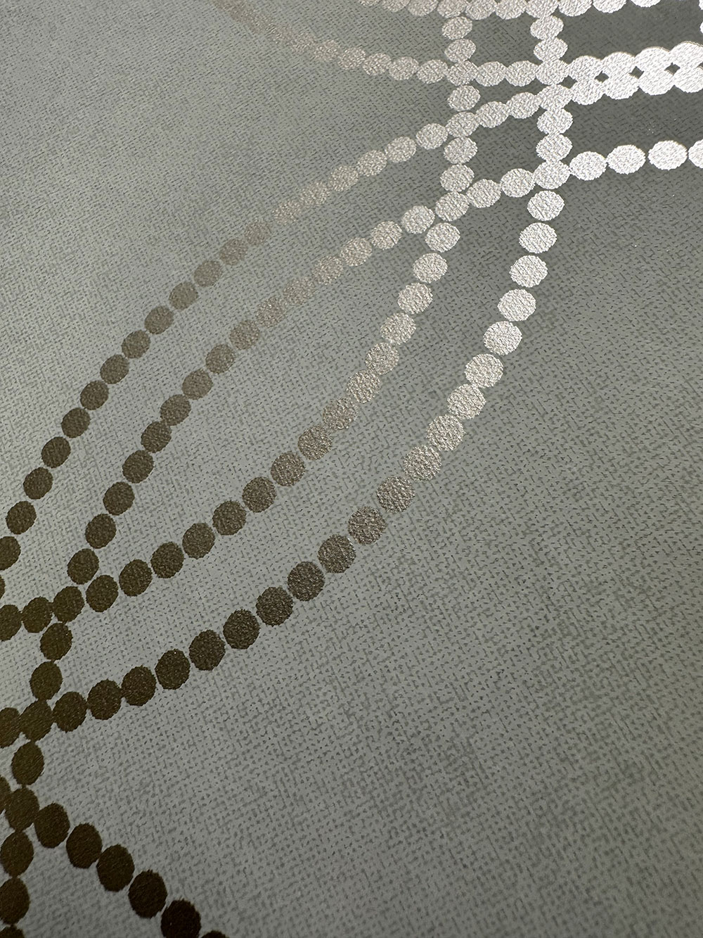 Glatte salbeigrüne Vliestapete mit goldenem geometrischem Muster.