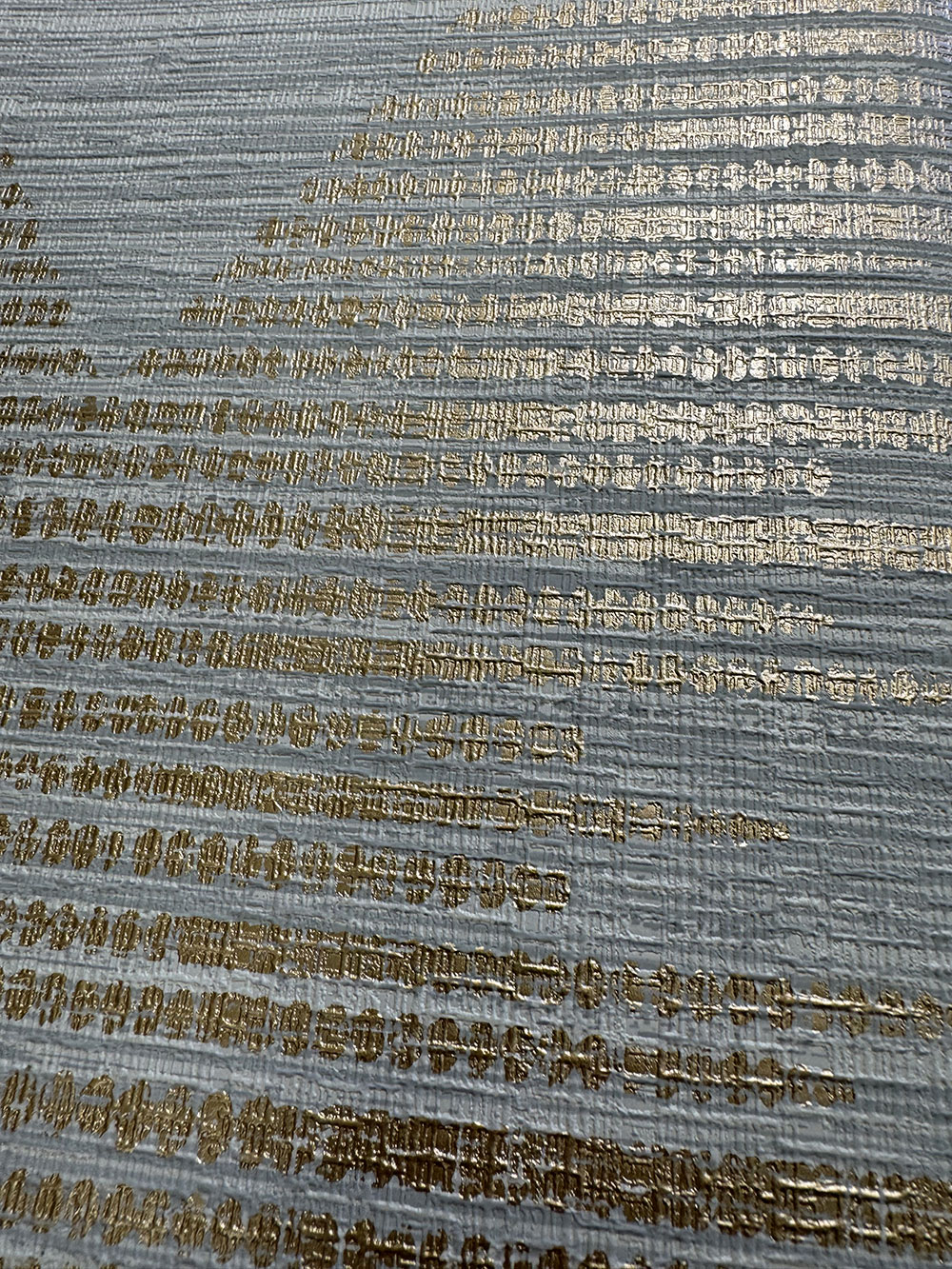Geprägte, grau-beige Vliestapete, geometrisches Muster, goldene Linien bilden Rauten.