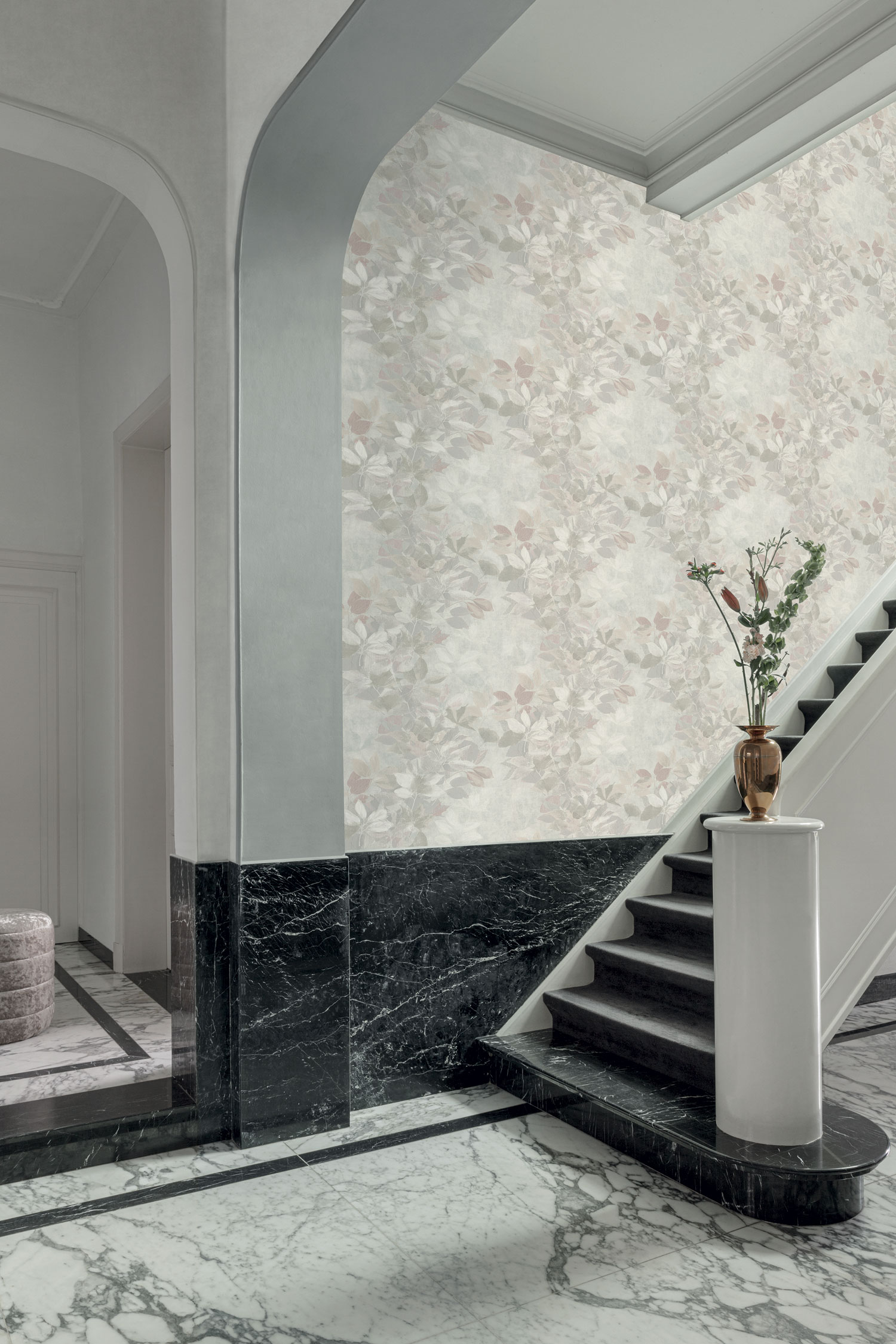 Graue Vliestapete mit Vinyloberfläche, Blättermotiven, stellenweise ein Hauch von Grün, Graublau und Rosa.