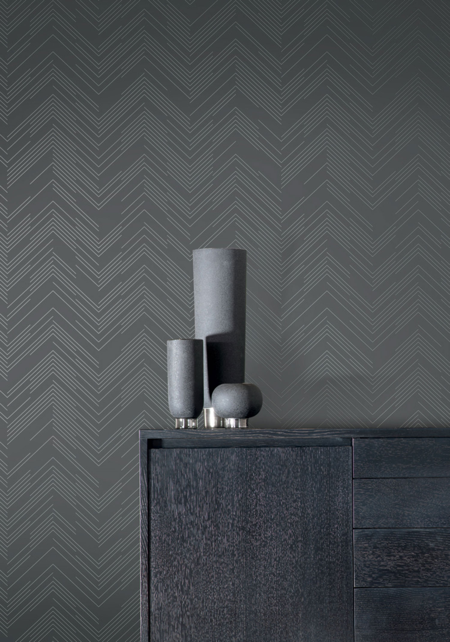 Dunkelgraue Vliestapete mit silbernem, geprägtem Zickzack-Muster.