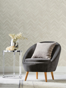 Cremefarbene Vliestapete mit goldenem, geprägtem Zickzack-Muster.