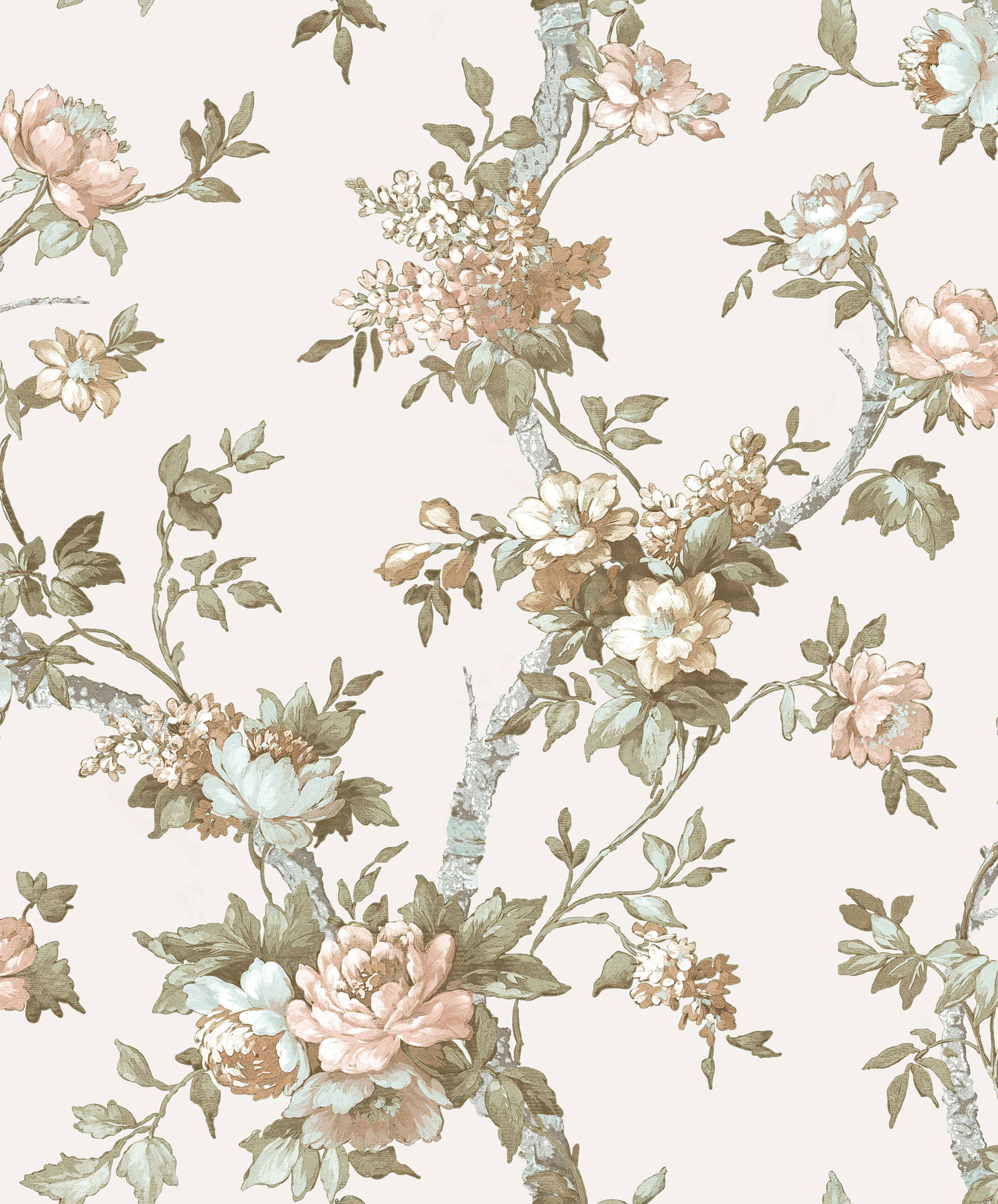Matte, weiße Vliestapete mit einem Muster aus grauen, hellblauen und beigen Blumen mit Blättern und Zweigen. Das Innenfoto dient nur zur Veranschaulichung – verschiedene Farben.