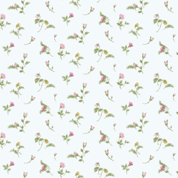 Matte, weiße Vliestapete mit kleinen Blüten mit Blättern in Rosa, Ocker und Beige.