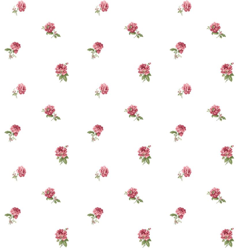 Matte, weiße Vliestapete mit kleinen Blüten mit Blättern in Burgund und Grün.