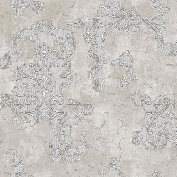 Luxuriöse geprägte Vliestapete mit Vinyloberfläche, goldFarbenenes barockes Ornamentmuster mit silbernem Hintergrund unter braunem Stuckputz.