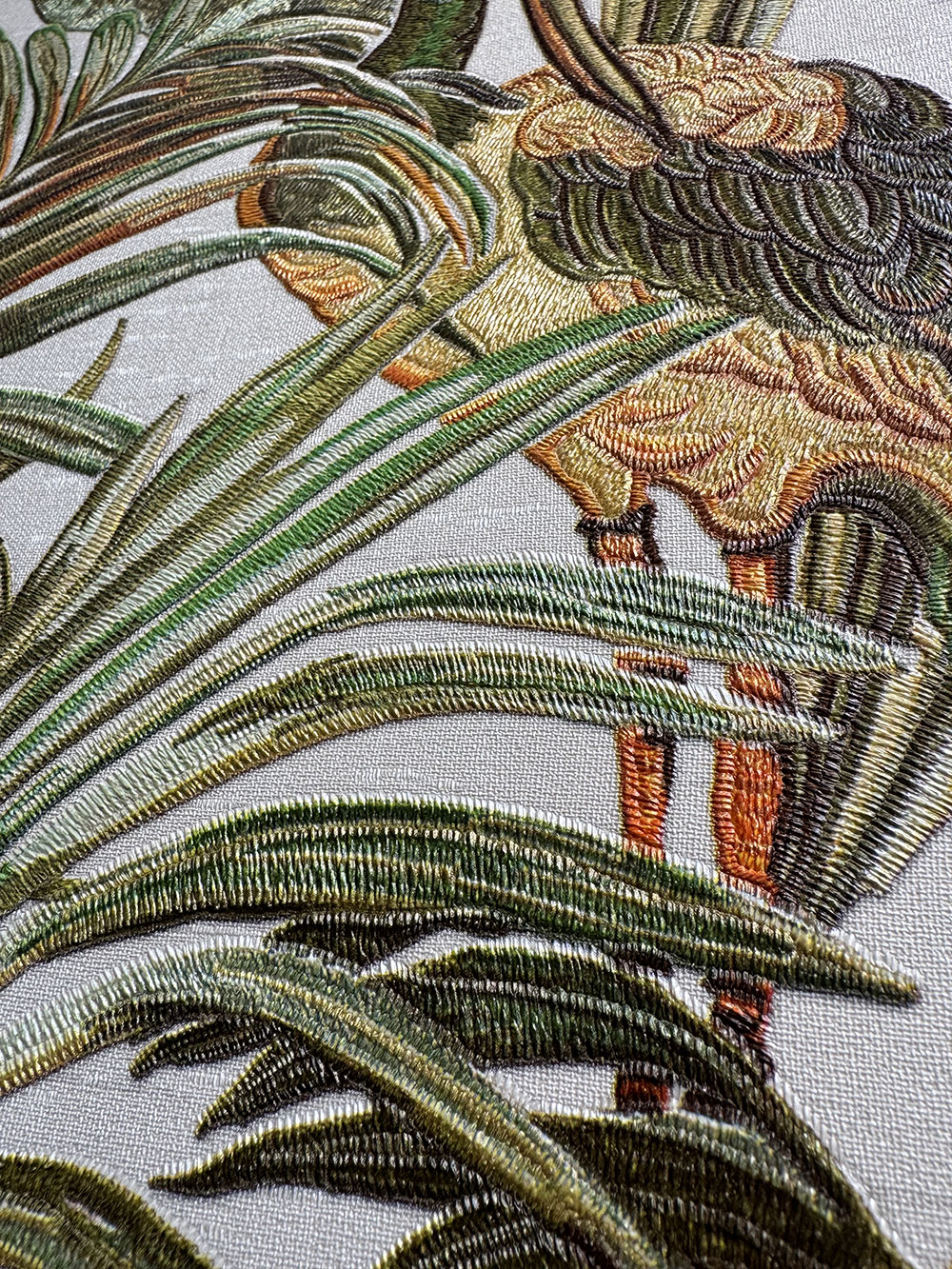 Vliestapete mit Vinyloberfläche – hellbeiger Hintergrund mit dezent Halbglanz, Metallic-Strukturen in Grün- und Orangetönen. Farben und Reflexionen ändern sich je nach Lichteinfall auf die Tapete.