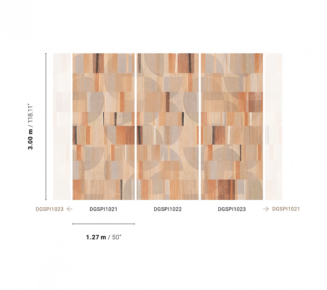 Geometrische Fototapete in Terrakotta-, Beige- und Grautönen, gröbere Gewebestruktur. Für größere Breite kombinierbar mit den Mustern DGSPI1022 und DGSPI1023 – siehe Foto.