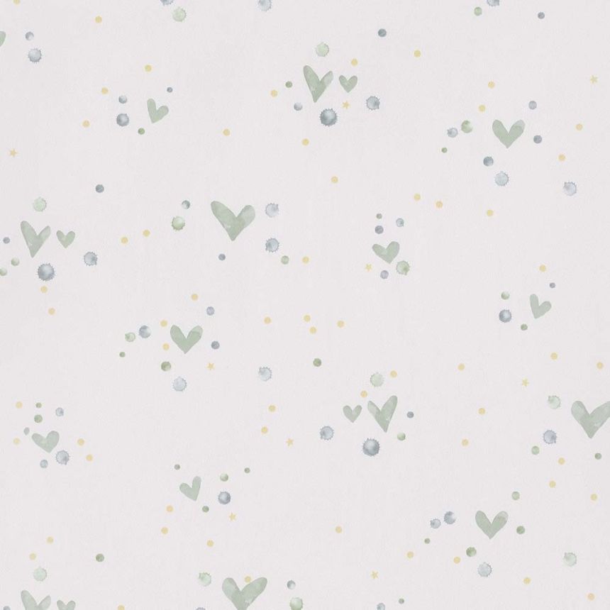 Weiße Vliestapete. Türkise Herzen und Kleckse und goldgelbe Kreise und Sterne.