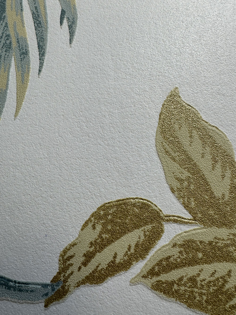 Cremefarbene Vliestapete mit Vinyloberfläche, Motive tropischer Blätter in Grün- und Ockertönen, stellenweise mit goldenen Akzenten.