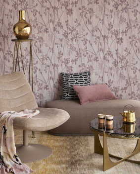 Sanft geprägte violette Vliestapete mit Vinyloberfläche, Motive von Zweigen und Blättern.