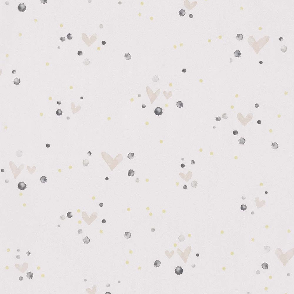 Weiße Tapete auf Vlies. Hellrosa Herzen, graue Kleckse und goldgelbe Kreise und Sterne.