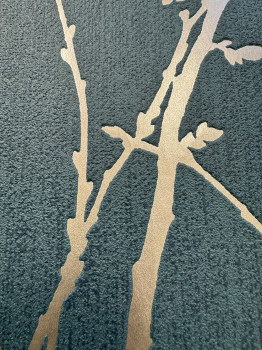 Grüne geprägte Vliestapete, Stoffstruktur, glatte metallische Zweige, helles Gold.