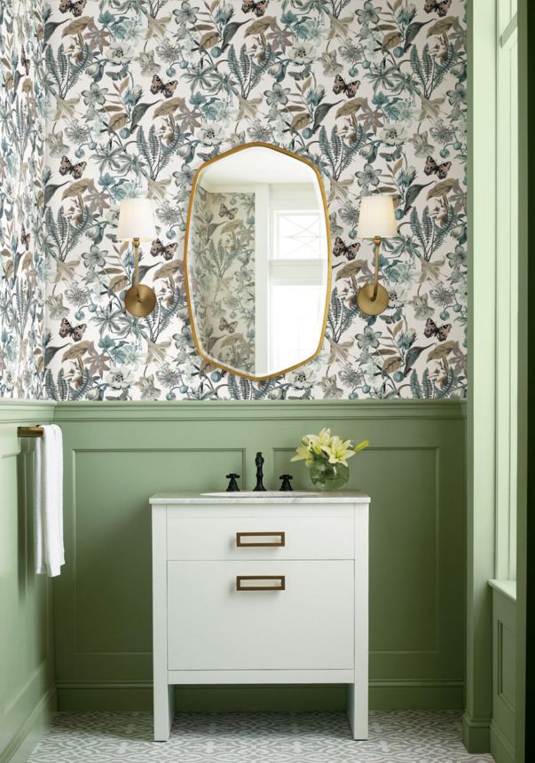 Weiße Vliestapete, Blumen und Schmetterlinge in Grau-, Braun- und Graublautönen.