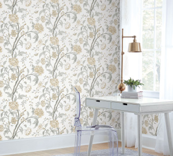 Weiße Vliestapete, Schmetterlinge, Vögel und blühende Zweige in Grau- und Beigetönen, Gold- und Silbermetallic-Details.
