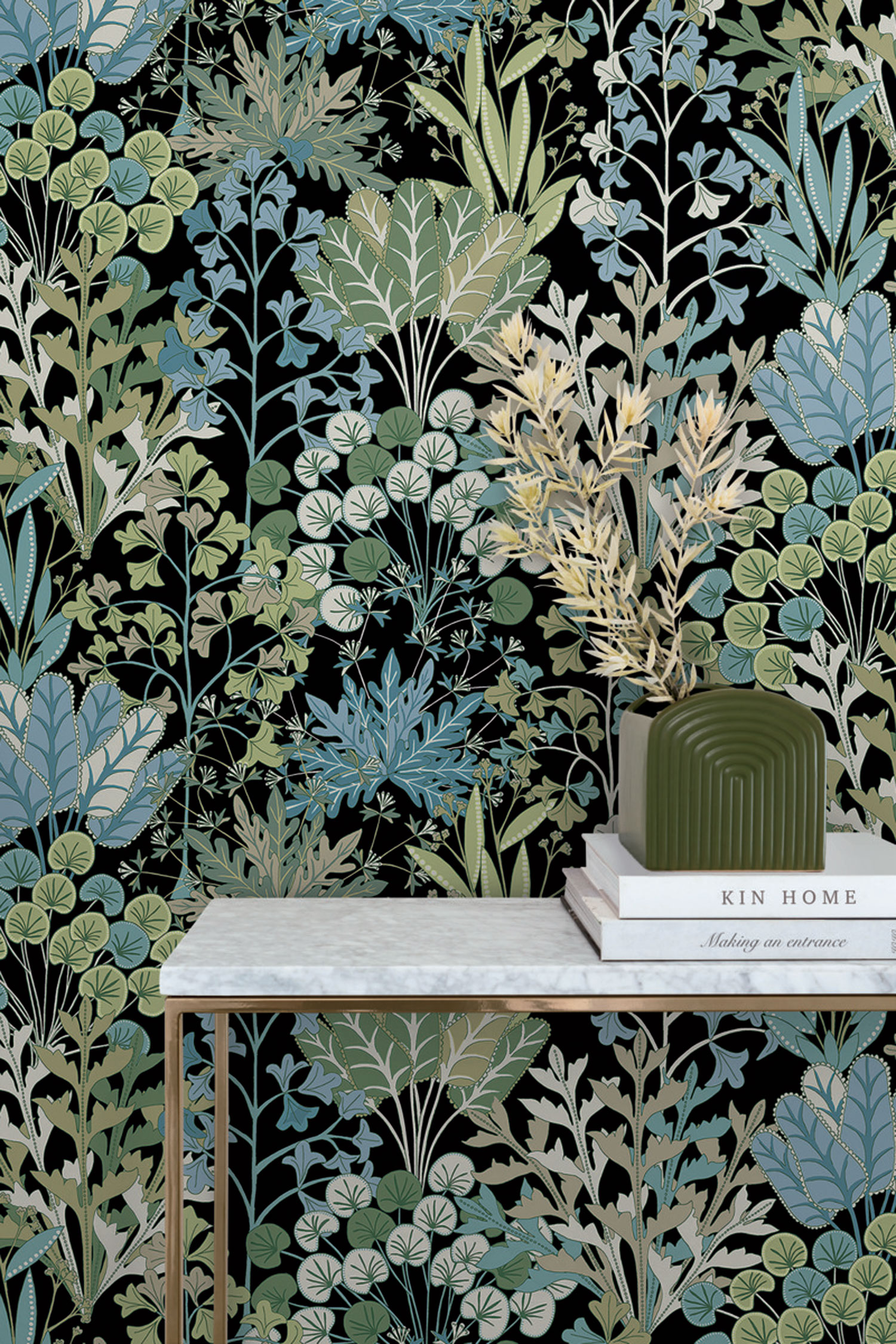 Schwarze Vliestapete, Pflanzen und Blätter in Grün-, Blau- und Beigetönen.
