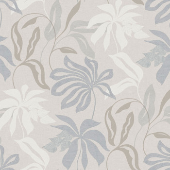 Cremefarbene Vliestapete mit Blättern in Grün-, Blau- und Ockertönen, Stoffstruktur.