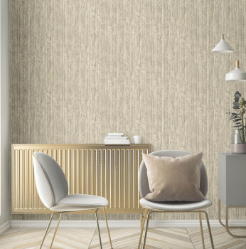 Luxuriöse bronzefarbene Vliestapete mit geprägten rosa Streifen auf einem Hintergrund, der Stuckputz imitiert.