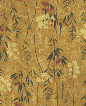 Halbglänzende blaue Vliestapete, Blumen und Blätter in den Farbtönen Grün, Blau, Ziegelrot und Goldbeige.