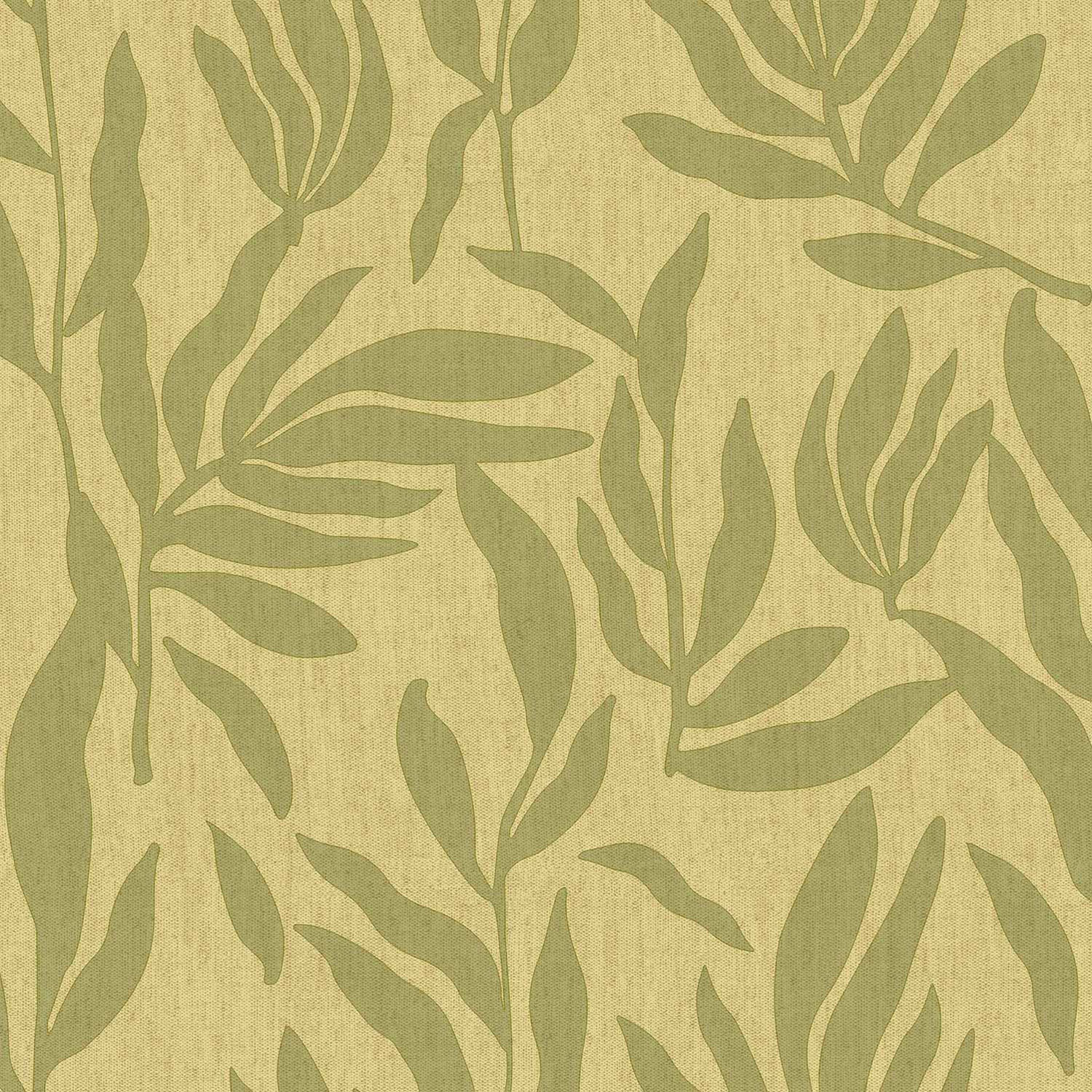 Luxuriöse gelbe Vliestapete mit Vinyloberfläche, Motiv aus Zweigen mit Blättern in grüner Farbe. Das Foto des Innenraums dient nur zur Veranschaulichung – verschiedene Farben.
