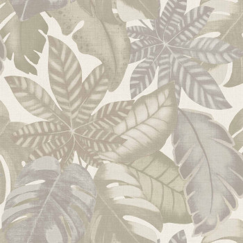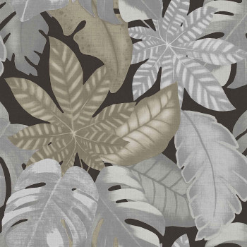 Luxuriöse schwarze Vliestapete mit Vinyloberfläche, Motiven tropischer Pflanzenblätter, Grau- und Goldtönen, Stoffstruktur. Das Innenfoto dient nur zur Veranschaulichung – verschiedene Farben.