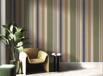 Luxuriöse Vliestapete mit Vinyloberfläche, Streifen in Grau, Beige und Grüntönen.