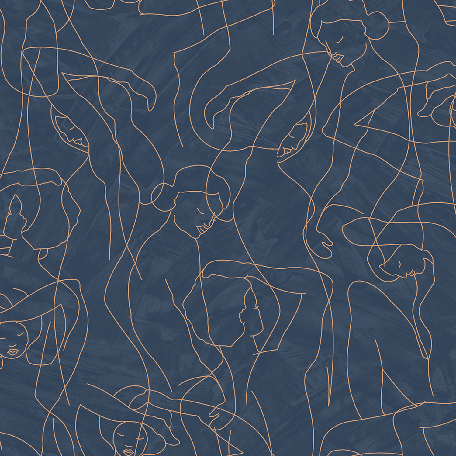 Glatte Vliestapete mit Vinyloberfläche, blauer Hintergrund, bronzefarbene Figurenkonturen.