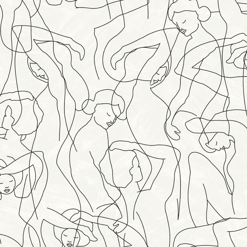 Glatte Vliestapete mit Vinyloberfläche, weißer halbglänzender Stuckhintergrund, schwarze Figurenkonturen.