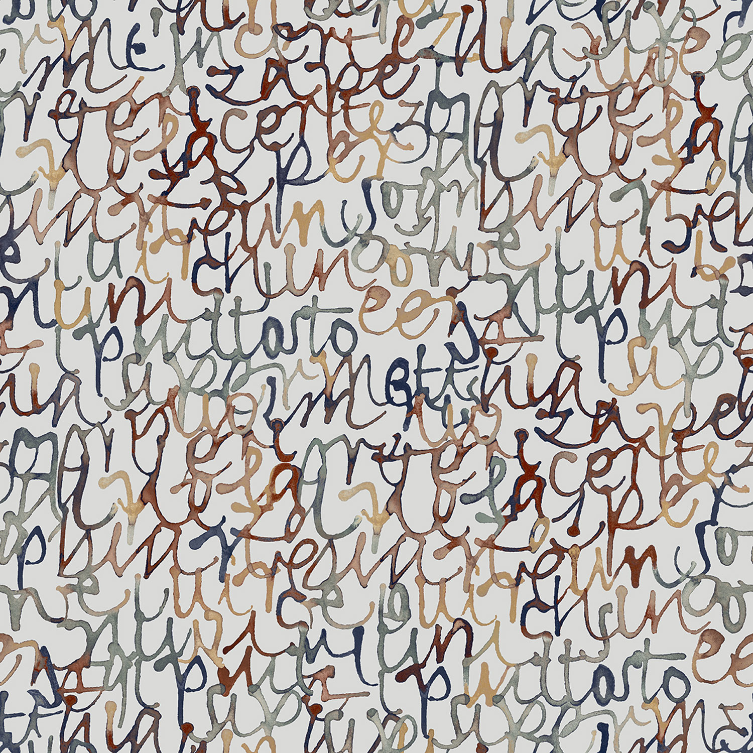 Vliestapete mit Vinyloberfläche, graublauem Hintergrund, abstrakter Pinselschrift in Blau-, Grün-, Ocker- und Burgundertönen.