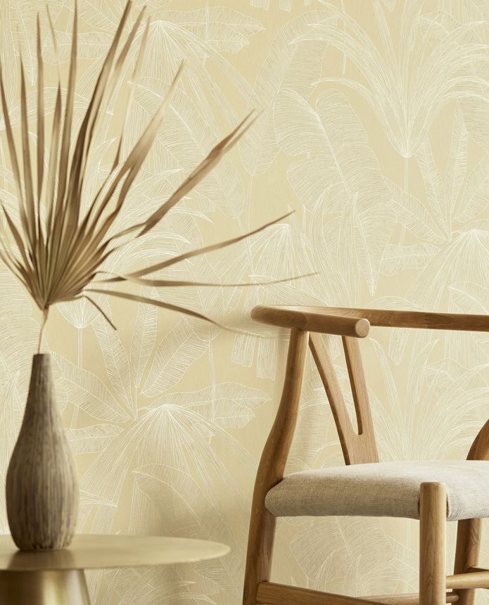 Glatte, matte, cremefarbene Vliestapete, tropische Palmenblätter in glänzenden Perlmutttönen. Das Innenfoto dient nur zur Veranschaulichung - verschiedene Farben.