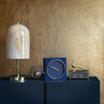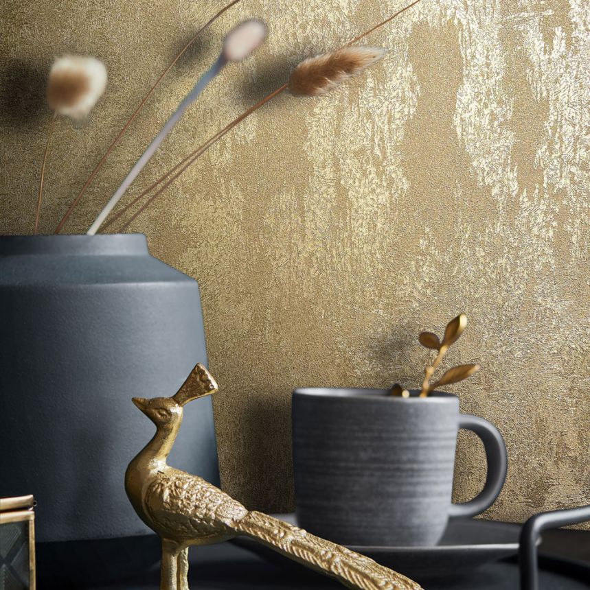 Vliestapete mit Vinyloberfläche, Dekor einer goldfarbenen Putzoptik, matt und mit leichtem Glanz, feine Struktur.