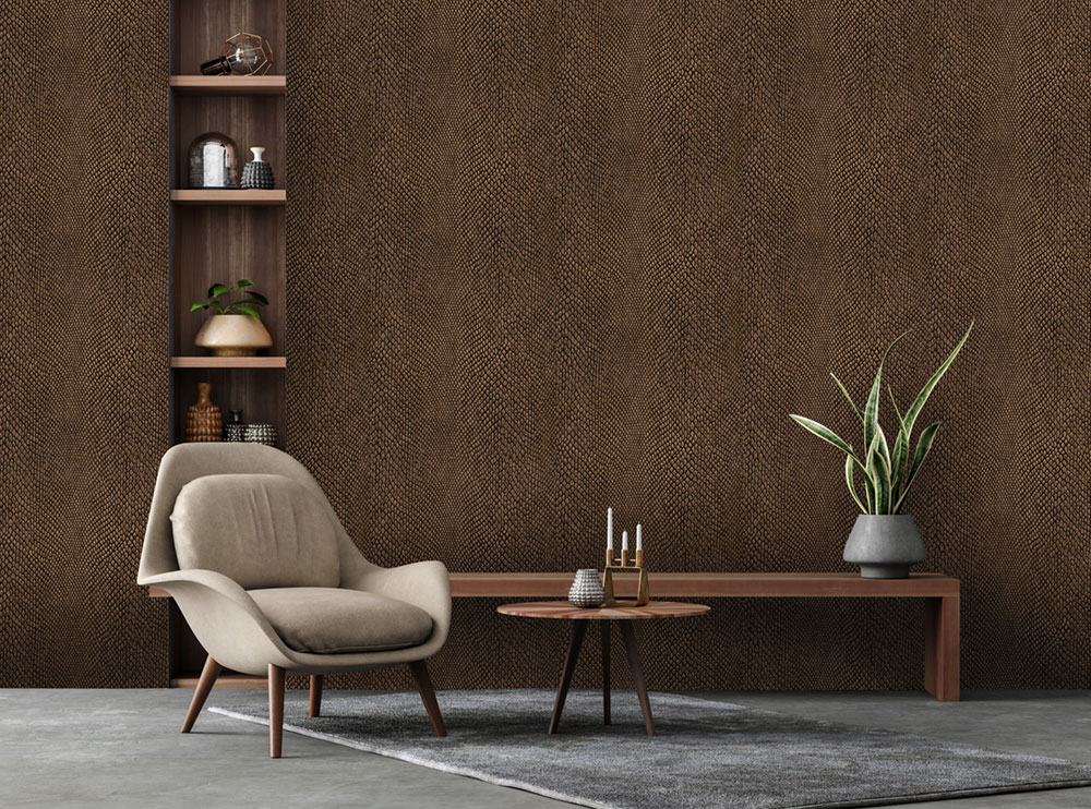 Halbglänzende Vliestapete mit Vinyloberfläche, Schlangenhaut-Imitat in Braun-Bronze-Tönen.