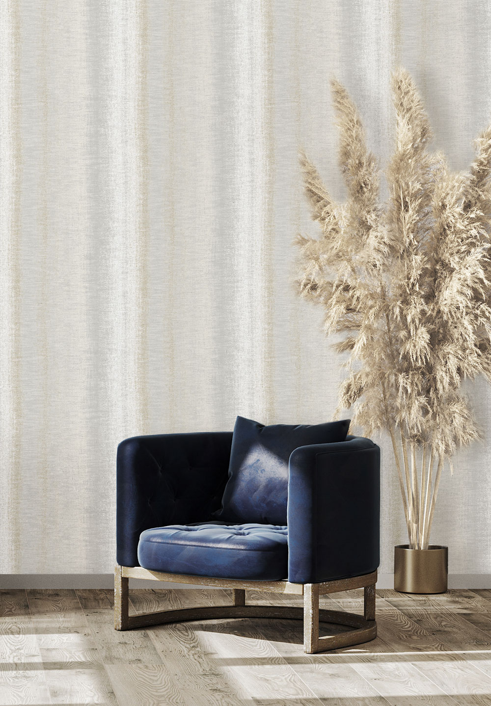 Fein geprägte, gestreifte, grau-beige-goldene Vliestapete mit Vinyloberfläche.