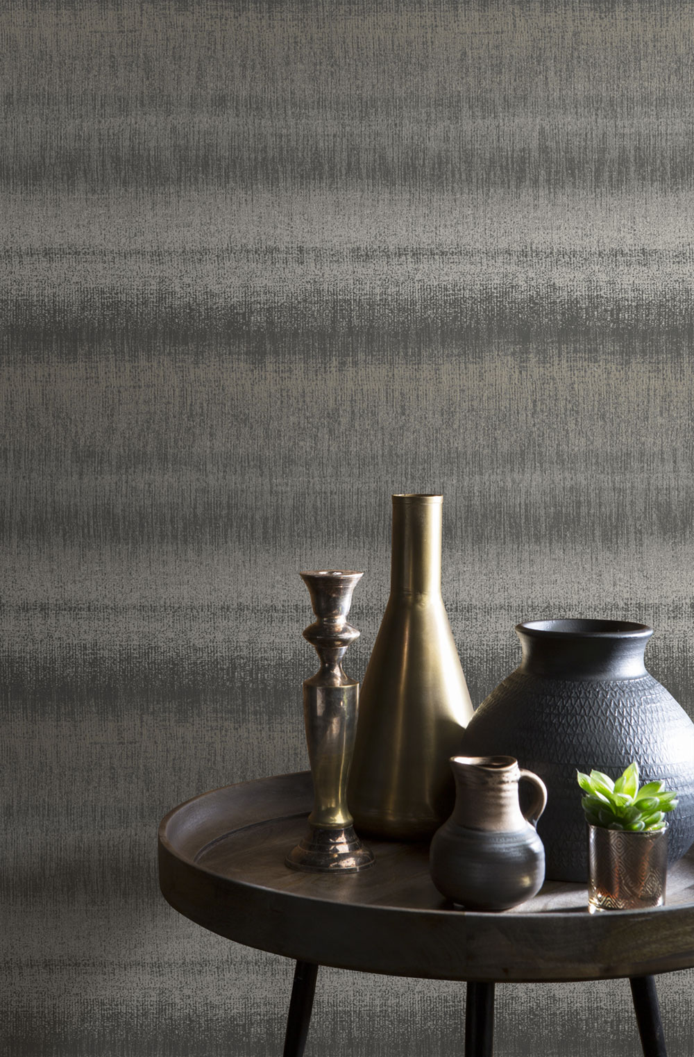 Fein geprägte, gestreifte, grau-braun-schwarze Vliestapete mit Vinyloberfläche, stellenweise metallische Silberreflexe.